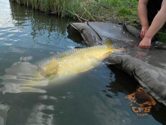 Fertőtlenítés és fényképezés után természetesen ő is visszanyerte szabadságát. Újrahúzást követően és adrenalinnal feltöltődve vártuk a következő jelentkezőt. A szép halak láttán horgaimat újracsaliztam és bizakodva visszatettem az általam szimpatikusnak vélt helyekre. Az idő gyönyörű volt, de a halak kapókedve erősen visszaesett. Dél körül végre megszólalt a jobbos botom jelzője. Rohanás, ráemelek a botra és érzem, hogy ez nem az a hal, amire vártam. Gyorsan kijött és vissza is ment a 1,5 kg-os amur... A szereléket gyorsan visszahelyeztem az előbbi kapás színhelyére, és folytatódott a várakozás. Pár percre rá megint a jobbos botom kapásjelzője törte meg a csendet, és a kontaktus felvétele után éreztem, hogy most is amurral lesz dolgom, és sajnos ez sem a nagyobbak közül való. Már majdnem szákba tereltem, mikor a balos, Monsterfish golyóval csalizott botom is elsült. Sanya rohan, bevág – láttam, az már jobb hal. Ekkorra az amur – ami kb. 4-5 kg-os lehetett – már a matracon feküdt, majd gyors fertőtlenítés után vissza is került a vízbe. Balos botomat kézbe véve éreztem, hogy jó ellenfél van a horgon.10 perces fárasztást követően sikerült ideiglenes rabságba ejteni ezt a csodaszép tükröst. A mérlegelést követően boldogságom nagy volt, mivel 12 kg-ról személyes rekordomat 12,60 kg-ra tudtam növelni.