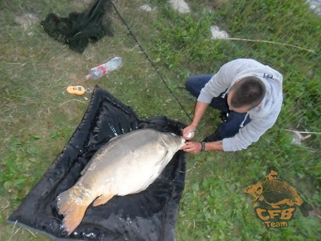 Szinte valósággal állíthatom, h imádják a CFB-s bojlikat. Sötétedés előtt behúztam a szerelékeket, frissíteni a csalikat. Megejtettem sötétedés közeledtével a magos etetéseket, pár szem bojlival, és halibut pellettel megspékelve. Ezen a napon még 9.49-es potykát fogtam éjjel 23.45-kor. Hétfői napon éjfél után kicsivel 8.66-os pontyot segítettem partra, majd utolsó halam hajnali 3-kor jelentkezett, ami egy 12.56-os tőponty volt. Meg kell jegyeznem, hogy 13 pontyból, 2 volt tőponty. Az idő nagyon viharos szeles volt, megnehezítette a behordást, a sátorozást, ezért a jó öreg terepjáróba kényszerültünk aludni. A rod-pod is nem 1-szer határán volt a felborulásnak. De az időjárás viszontagságainak ellenére, nagyon jól éreztük magunkat.