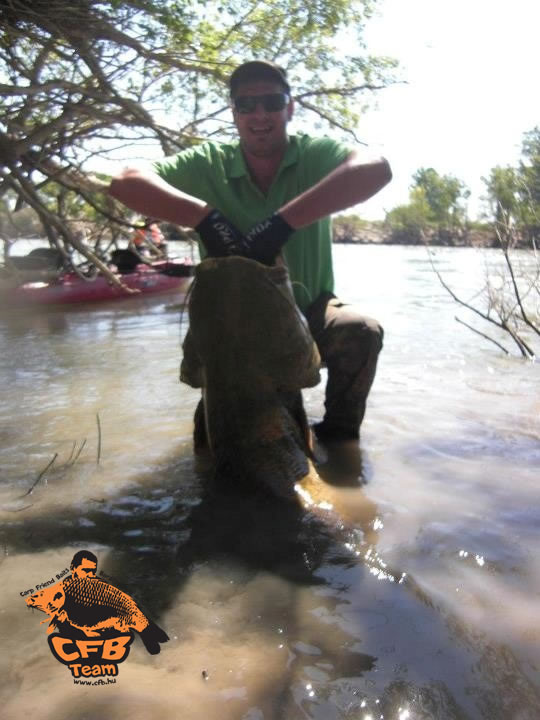 2 kajakkal vágtunk neki a folyónak, Gábor egyedül, én pedig Robertoval. Műcsaliként mind a hárman sárga színű gumihalat használtunk. Nagy reményekkel dobáltuk a partszéleket, bedőlt fák melletti részeket. Mintegy 15 percet követően Robertonak sikerült is akasztani egy harcsát, de pár pernyci fárasztást követően sajnos kiakadt a horog a hal szájából. Mindenestre bizalomra adott okot a kapás. Mintegy 2 órája dobáltunk már lelkesen, amikor nagy rántást éreztem botomon. Mondanom sem kell, azonnal elborította az adrenalin testemet. A hal óriási erővel kezdte húzni a 45-ös fonott zsinórt az orsó dobjáról, a bot szinte karikába hajlott. Bár soha nem találkoztam még ekkora erővel a bot másik végéről, próbáltam keményen megfékezni a halat, hisz rengeteg bedőlt fa és akadó volt található a folyó ezen szakaszán. A harcsa könnyedén vontatta az ekkor már összekötött két kajakot.