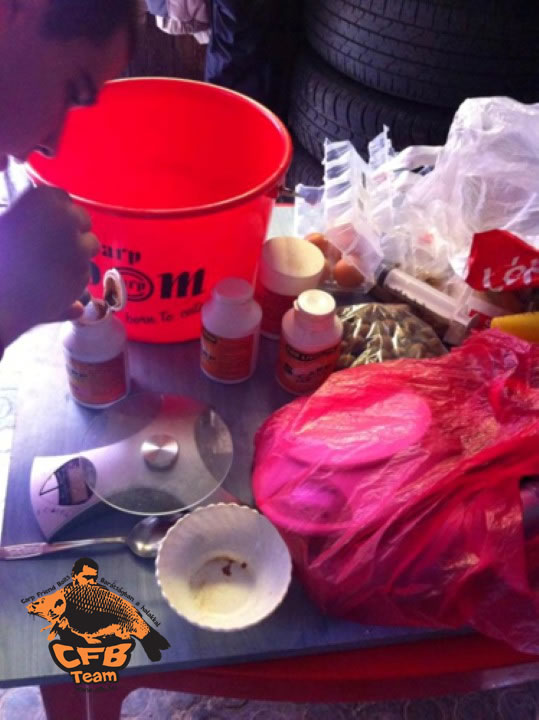 A horgászat előtt egy héttel kezdtük el legyúrni és elkészíteni a CFB alapmixekből álló bojlikat és pasztát. Összesen 2 kg főzött és 1 kg oldódó Redarmy, 1 kg főzött Full Liver és 1 kg Monsterfish golyót vittünk magunkkal 0,5-0,5 kg Redarmy és Full Liver pasztával. A főzött bojlikat 2 napig, az oldódót pedig 1 teljes hétig szárítottuk.