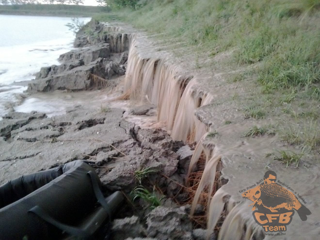 Erre a hétvégi horgászatra jó barátom, Bogdán Dávid ( Csoki ) is elkísért. A tavon rajtam kívül két régi ismerősöm Hepp Csaba és Prohászka István is horgászott. Még sötétedés előtt bepakoltuk cuccainkat a kiszemelt helyre, de horgászni már nem tudtunk, mert elkezdett esni az eső így a sátorba visszahúzódva, próbáltuk átvészelni az égi áldást . Már legalább egy órája esett, amikor a mellettem lévő kb. 30m-es partszakasz annyira felázott az esőnek „köszönhetően"hogy hírtelen lecsúszott, ezért kicsit meg ijedtünk, hogy a sátortól 2m-re leszakadt egy jókora partszakasz.