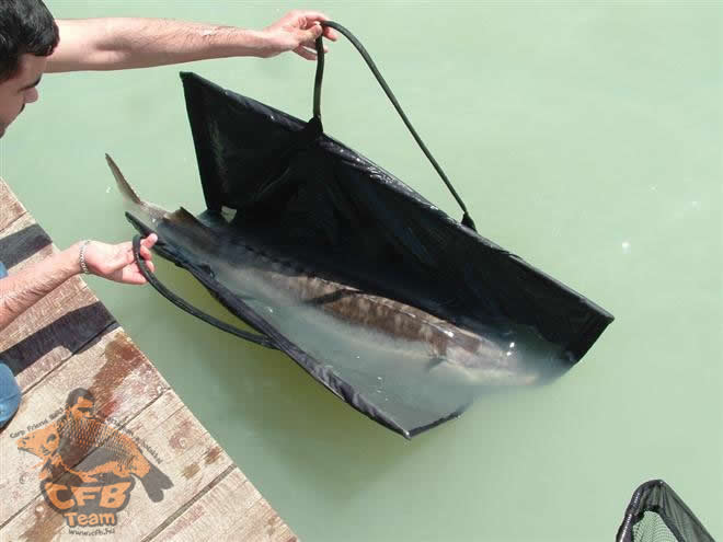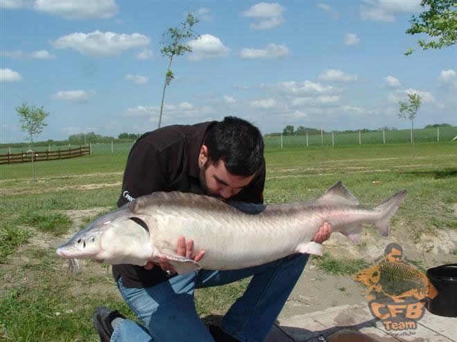 Miután Laci összepakolt és hazament a családdal, újra egyedül maradtam. A szél eléggé felerősödött, de szerencsére még rá lehetett menni a vízre. Délutánig nem történt semmi említésre méltó. Ekkor körbejárta a tavat a tógazda egy közös ismerőssel, aki tavaly mellettünk horgászott. Már vagy fél órája beszélgettünk, épp a tokhalakról, csalódottan mondtam, hogy sajnos még nem sikerült ezen a túrán fognom, amikor elsült a jobbos botom, ami a part közelében volt bevetve. A reggeli sikernek köszönhetően már ezen a boton is a KD-rig volt, egy szem pink pop-uppal és egy fél szem Monsterfish-sel. Elsőre nem éreztem a halat túl nagynak, de a part közelében megláttuk, mekkora jószággal hozott össze a sors. Egy hatalmas tokhal küzdött a horgon! Reméltem, hogy nem történik semmi baj és meg tudjuk szákolni a tokot. Nagyon erősen, dinamikusan viselkedett, de jó 20 perces fárasztás végén a merítőbe került! Ketten tudtuk odavinni a matracra. Jött a mérlegelés, a hal kilógott a mérlegelőből. A digitális mérleg 19,40 és 19,60 között ugrált, így megegyeztünk, hogy a hal tömege 19,5 kg! Életem legnagyobb hala! A fotózás nem volt egyszerű, hihetetlen erő van ezekben a halakban! A visszaengedés művelete majdnem addig tartott, mint maga a fárasztás, a tokok ugyanis nehezen térnek magukhoz, és ha idő előtt engedi el az ember őket, lesüllyednek a tó fenekére és belefulladnak az iszapba. Szerencsére itt szó sem volt ilyenről, a hal rendben, egészségesen elúszott.