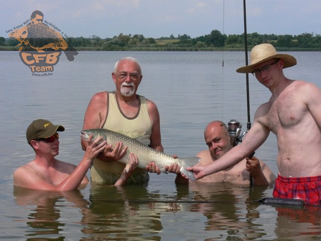 De az igazán kapitális, hőn áhított hal váratott még magára..de éreztem, hogy valami különleges történni fog!A szokásos ceremónia után egy kis pihenőre tértünk.Éppen legmélyebb nagypontyos álmomat törte meg a számunkra oly kedves hang..amikor a jelzőnk az életéért visít!Brutális erejű kapásra ébredtem a hajnal még szürke fényeiben.Nem tétováztam, megemeltem botomat, de ekkor még semmit sem észleltem ellenfelem erejéből.Szépen komótosan haladtam halam fölé.Ahogy utolértem, meglepődve tapasztaltam, hogy szinte alig ment arrébb a bójától.Szépen türelmesen várt, majd első emelésemre könnyedén szépen megmutatta nekem kivel is mertem kikezdeni.Kemény 20perces fárasztás után már mutatta magát, azonban rossz előérzetem támadt mikor hatalmas farok úszójával elkezdte zsinóromat „pengetni".Próbáltam megmeríteni, ami nagy nehézségek közepette sikerült!Örömömben belekiáltottam a párás hajnali ködbe..MEGVAGY!Szépen lassan kieveztem..élveztem a pillanatot, minden egyes miliőjét megakartam ragadni, magamba szívni! Kiérve már várt a csapat..mérleg mérőzsák, minden előkészítve.A halam nem érte el a bűvös határt, de cseppet sem érdekelt, hiszen gyönyörű aranyszínű, fekete hátú tükröst fotózhattunk a felkelő nap fényeiben..Beszéljenek a képek!