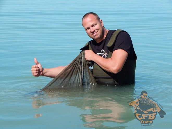 Az első kapás is szinte menetrend szerűen érkezett pontosan éjfél után,a bevágást követően éreztem hogy ez már a termetesebbek közöl való.Gyorsan belebújtam a melles csizmába és irány az éjszakai Balaton kb 100 méterre járhattam a vízben amikor láttam hogy a hal célba vesz egy be helyezett mólót ami a parttól kb 150m távolságban volt , megpróbáltam még beljebb menni a vízben de ekkor már a hullámok be csaptak a melles csizmába derékig eláztatva.Úgy éreztem hogy menni alig birok a csizma és a víz súlyától ,de centiméterről centiméterre loptam a távolságot a hal és közöttem ami nagy szerencsémre pár méterre úszott csak el a móló mellett,ekkor már éreztem hogy fotó alany lesz és sikeresen megszákoltam a merülő fejlámpám fényében.Irány vissza a part ami egy örökkévalóságnak tünt a teli melles csizmával.Mérlegelést követően pontyzsákba raktam a másnapi fotózásig.Másnap amikor eljött a hazaindulás, ki derült hogy ez a hal volt a túra legnagyobbja a maga 15 kg os súlyával,és mérhetetlen erejével,kalandos fárasztásával fel tette a koronát az egyhetes túrámra.