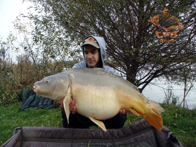 Nagyon sötét volt már mikor a szerelékeket Zoli világító bójája felé elkezdtük behúzni. Sajnos ez már nem a nyári időszak mikor este fél 10-kor fényes napsütésben lehet horgászni. Az idő az még csak kora esti volt 18 óra körül járhatott mikor a sötétben a swingerem világítására lettem figyelmes és már szólt is a jelzőm. Ráemelés után tó közepén bőszen húzza le a zsinórom. Komótos 10 perc után fejlámpám fényében megpillantottuk ezt a jóféle tövest.