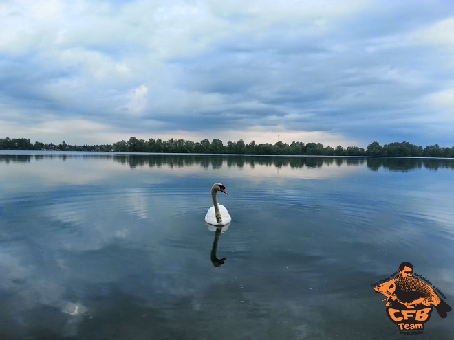 Az indulás körüli időszakban már figyeltük az időjárást és végül április 19-én nekiindultunk a hosszú, több mint 3 órás útnak. Délután 5 óra körül érkeztünk a tóhoz. Amint megláttuk, rögtön tudtuk, hogy ez az, amit kerestünk. Idáig is tudtuk, hogy hatalmas a vízterület, de ez akkor tudatosult bennünk igazán, amikor ott álltunk a partján. Hosszas nézelődés után, úgy döntöttünk, hogy a tó északi partján, a kis szigettel szemben alakítjuk ki a táborhelyünket nomád körülmények között. Itt megjegyzem, hogy bár mesterséges vízről van szó, a tó kora miatt a régen bányászott területeket már teljesen visszahódította a természet és nagyon színes növény és állatvilág alakult ki. Az állatok közül a kedvencünk, egy fehér hattyú állandó vendégünk volt a héten és neki is ízlettek a CFB csalit.