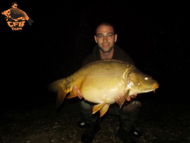 Már az első éjszaka sikerült kapást elérnünk. A 8 méteres mélységben elhelyezett jobbos botom jelzője szólalt meg és kezdett folyamatos sípolásba. Csónakkal mentem a hal után és rövid fárasztást követően sikerült szákba terelnem. Nagyon örültem neki, mert láttam, hogy 10 kg feletti lesz. A partra érve gyorsan megmértük a súlyát. 11,50 kg volt. Eltettük pontyzsákba a másnap reggeli fotózásig. Csak nappali fényben láttuk, hogy milyen gyönyörű arany színben pompázik.