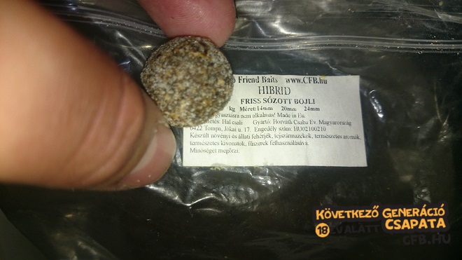 A hajszálelőkére 1 szem 20mm-es HIBRID bojli került, majd mellé PVA hálóba egy alap method mix.
