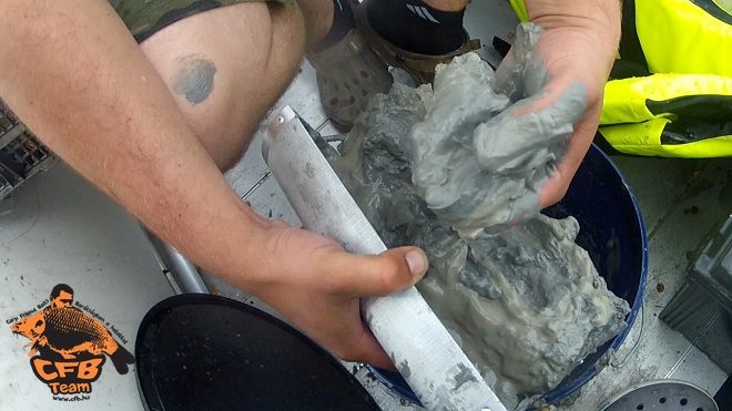 A mederfeltérképezés során vált világossá számunkra, hogy nem túl sok minden rejlik a fenéken. A mindössze 7 fokos vízréteg alatt 90-100m-ig kopogós, kemény placc némi kagylóval, majd ezt követően 30-40cm vastag, világosszürke, nagyon lágy iszap egészen 350m-ig, aminek a felszínén kecskeköröm kagylóhéj terült el szinte mindenhol, melyet valószínűleg a vízalatti áramlat hordott be az egész öbölbe. 350m-en találtunk egy kb. 3 sátor nagyságú kőszórást, aminek a széle épp a szektor határát súrolta. A vízmélység sem volt túl változatos: kb. 220cm-ről mélyült 330cm-re, szépen egyenletesen.