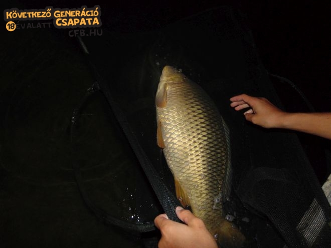 Miután újrahúztam, visszafeküdtem, hogy aludhassak még pár órát reggelig. Ez az elmélet újra megdőlt, hiszen jó fél óra múlva a kapásjelzőm visítására ébredtem. Siettem is kifele, nehogy befusson vele a nádba. Már a kapásán éreztem, hogy jobb hal lesz. Ráemeltem és elkezdődött a harc. A partszélig viszonylag könnyen kihúztam, de utána mindig visszatört a mélyebb részre, majd egy 20 perces fárasztás után tudtam megszákolni pikkelyes ellenfelemet, akit bőven 8 kg felettire tippeltünk.