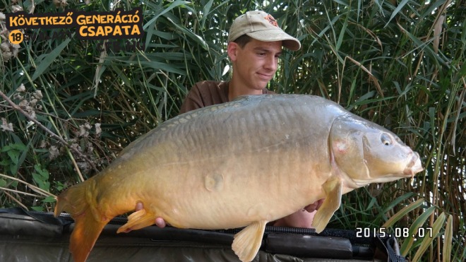 Már csak egy botom volt a vízben, mikor azt is megtalálta valami. Bődületes ejtésbe kezdet. Utána tekerve utolértem halamat és felvettem vele a kontaktot. Éreztem ez egy jó hal lesz, húzatta magát még a fejét sem rázta meg. A part előtt aztán mélybe törve lent tartotta magát. Kb. 5 percig nem is tudtuk, hogy milyen ponty akadt a horgunkra, amikor aztán megláttuk széles tükrös testét. Egy jó 10 perces part előtti fárasztás után sikeresen szákoltuk.