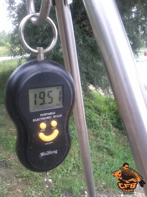 Az éjszakai órákban pár kisebb ponty tette tiszteletét az etetésen. A reggeli ébredés után, csalifrissítés és újbóli etetés következett. Dél körül járt már az óra, mikor Márkó botján erőteljes kapással valami megindult eszement erővel. Gyors bevágás után egy hosszadalmas fárasztás következett. Csak centiről centire sikerült neki a halat közelebb húzni, melyet bő fél óra fárasztás után tudtam megszákolni. Ekkor látszott, bizony ez új egyéni rekord. Gyorsan mérlegeltünk is, a hal pontos súlya 19,51 kg, melyet egy szem 14 mm CFB Deep Sea-vel sikerült fognia.