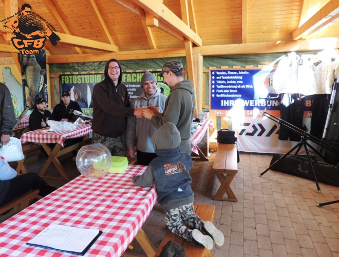 Hétfőn reggel nyolc óra előtt érkeztem a tóhoz, ahol már sok csapat volt. Mindenki térképpel a kezében jött ment, és próbálta a jobb helyeket bejelölni és a legtöbb információt begyűjteni. Sok csapatnak fogalma sem volt róla, hogy milyen meglepetésekben lesz része, mert a három héttel ezelőtti esőzések hatására a vízszint majd 40 centit emelkedett és emiatt az eddig látható bokrok ismét víz alá kerültek. A regisztráció után kiderült, hogy eddig 23 csapat érkezett meg, a két magyar csapaton kívül többségében Ausztriából, Németországból, Szlovákiából és egy csapat még Litvániából. Sokan a jelenleg is fennálló migráns helyzetre hivatkozva nem merték megkockáztatni a több száz kilométer-es utat. Így legalább volt mindenkinek elég területe, és tudott sekélyebb és mélyebb részeket egyaránt horgászni. Végre elérkeztünk a sorsoláshoz, ami úgy zajlott, hogy a főszervező kislánya kihúzta az első csapat nevét, aki húzhatott magának egy helyet. Ezután ez a csapat húzta ki a következő csapat nevét és így ment ez végig. Mi az utolsó háromban maradtunk benn és a hosszúsziget közepén levő helyet sikerült kihúznunk.