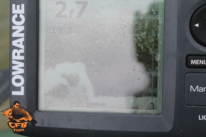 Gyors kipakolás után gumicsónakkal elindultam az előttem elterülő területet radarral illetve tapogatórúddal feltérképezni. A jobb oldali botommal az akadók elé horgásztam 1,2-1,4m sekély vízben.