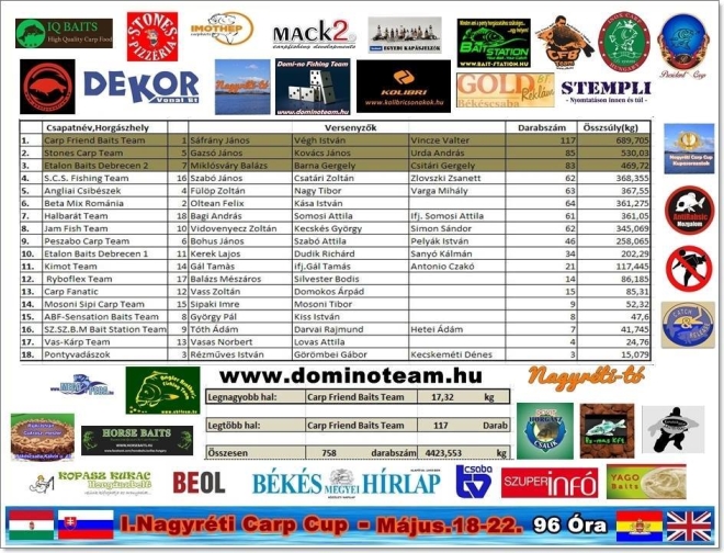 Utolsó éjszaka már mindenki nagyon fáradt volt, de kitartottunk az utolsó töltényig, így a verseny végéig még 23 db halat zsákmányoltunk. Elérkezett a verseny vége, amit dudaszóval jelzett Oláh Imi szervező. A verseny így alakult: