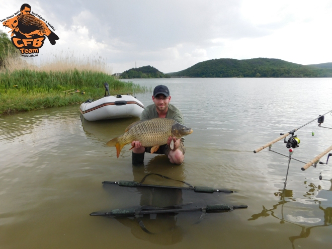 Az első kapás 23 óra magasságában érkezett. A 190 méterre elhelyezett botomra jelentkezett maszatolós kapás. Szakadó esőben csónakkal mentünk a hal után. Közben a szél és a hal is megnehezítette a dolgunkat. A szél folyamatosan tolt minket a gát irányába, a hal pedig nem akart feljönni a fenékről. Egy hosszúra nyúlt fárasztás után egy 17,20 kg-os tőpontyot szákoltunk, aki 24 mm-es Deep Sea World bojlira éhezett meg. Letároltuk a halat a reggeli fotózásig, de közben folyamatosan szakadt az eső és teljesen eláztunk. Visszahúzódtunk a sátorba, hogy megszabaduljunk a vizes ruháktól, de épphogy levettül az esőruhát, valami bődületes erővel húzta a zsinórt Tomi orsójáról. Nem volt mit tenni: esőruha vissza, csónakba be és nyomás utána. Ha lehet ez a fárasztás még az előzőnél is hosszabbra nyúlt. Mikor először megláttuk a halat a csónak mellett felfeküdni, már sejtettük, hogy Tomi első 20 kg feletti halát sikerült megfognunk. Gyorsan alátoltam a merítőt és izgatottan indultunk ki a part felé, hogy lemérjük. Nem tévedtünk. A mérleg 20,1 kg-t mutatott, ezt a halat is letároltuk. Szerencsére az eső közben elállt, így vissza tudtuk vinni mindketten a kint lévő szerelékeinket. Az éjszaka hátralevő része csendesen telt. Több kapás nem volt, de legalább kicsit meg tudtunk száradni.