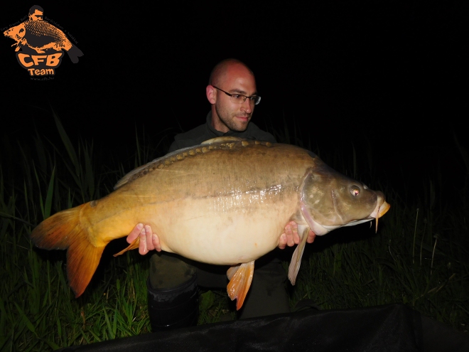 Fotózás után visszahúztam a szerelékemet, 2-3 marék Deep Sea World bojli kíséretében. A következő kapásra csak néhány órát kellett várni. Finom, ejtős kapás után indultam a hal fölé. Magamban már el is könyveltem, hogy a nagy golyó ellenére megtaláltak az apró ponyok, vagy a dévérek. Mire a bójámhoz értem, akkor tudatosult bennem, hogy a hal már jócskán elhagyta azt. Fölé érve, az első ráemeléskor szembesültem, hogy jobb hallal volt dolgom. Nem adta könnyen magát, de pár perc fárasztás után egy szép, hosszúkás formájú, 17,6 kg-os tőpontyot szákoltam. Biztonságban kivittem a halat a bölcsőbe és felébresztettem Tomit, hogy készítsünk róla néhány fotót.