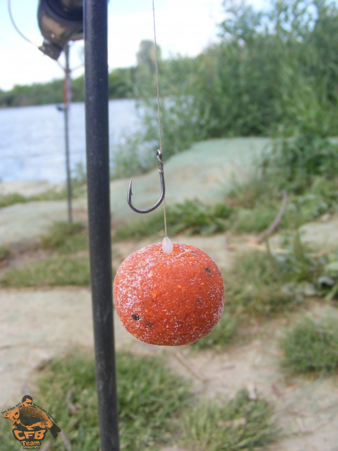 A felszerelés ismét a helyére került. A másik botomat is sikerült felcsalizni. Itt a horogelőkére két szem 10 mm-es főtt Black Jack bojli került. Etetőanyagnak a CFB halas method mixét használtam, amit Feeder Method aroma liquiddel locsoltam meg Full fruit ízben. A szereléket egy a mederben jól látható tuskó mellé dobtam.