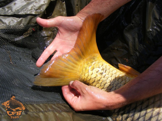 Nem telt el fél óra és újabb jelentkező akadt a Red Armyra, de sajnos lemaradt az akadó miatt. A csali frissítése után csónakba ültünk és elindultunk, hogy a golyó ismételten a helyére kerüljön. Nem haladtunk 30 métert, amikor a barátom 7 éves kisfia kiabált, hogy kapás van a dupla Black Jack-es szerelékemen. Partraszállás után átvettem a botot. Ekkorra a hal már átment édesapja 3 szereléke alatt, így a meredek parton egyensúlyozva átfűztem botomat a rod pod alatt. Egy közel tíz perces fárasztás után sikerült a halat megszákolni. Mérlegelésnél 7,5 kg-on állt meg a mutató. Ekkor jött a következő hideg zuhany. Egy szerencsétlen mozdulat következtében eltörött a harmadik bottag a rezgőspicc illesztésénél. Egy órás töprengés után úgy döntöttem, hogy minden mindegy alapon harcba állítom a kedvenc feederemet. Levágtam a törött részt, felcsaliztam és bedobtam a tuskó előtti területre. Egy óra elteltével egy húzós kapásra emeltem rá. A tettes egy 3 kilogrammos forma ponty volt, ami két szem 10 mm-es főtt Krill bojlira csábult el.